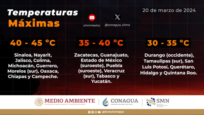 Temperaturas máximas de 35 a 40 °C: Zacatecas, Guanajuato, Estado de México (suroeste), Puebla (suroeste), Veracruz (sur), Tabasco y Yucatán.