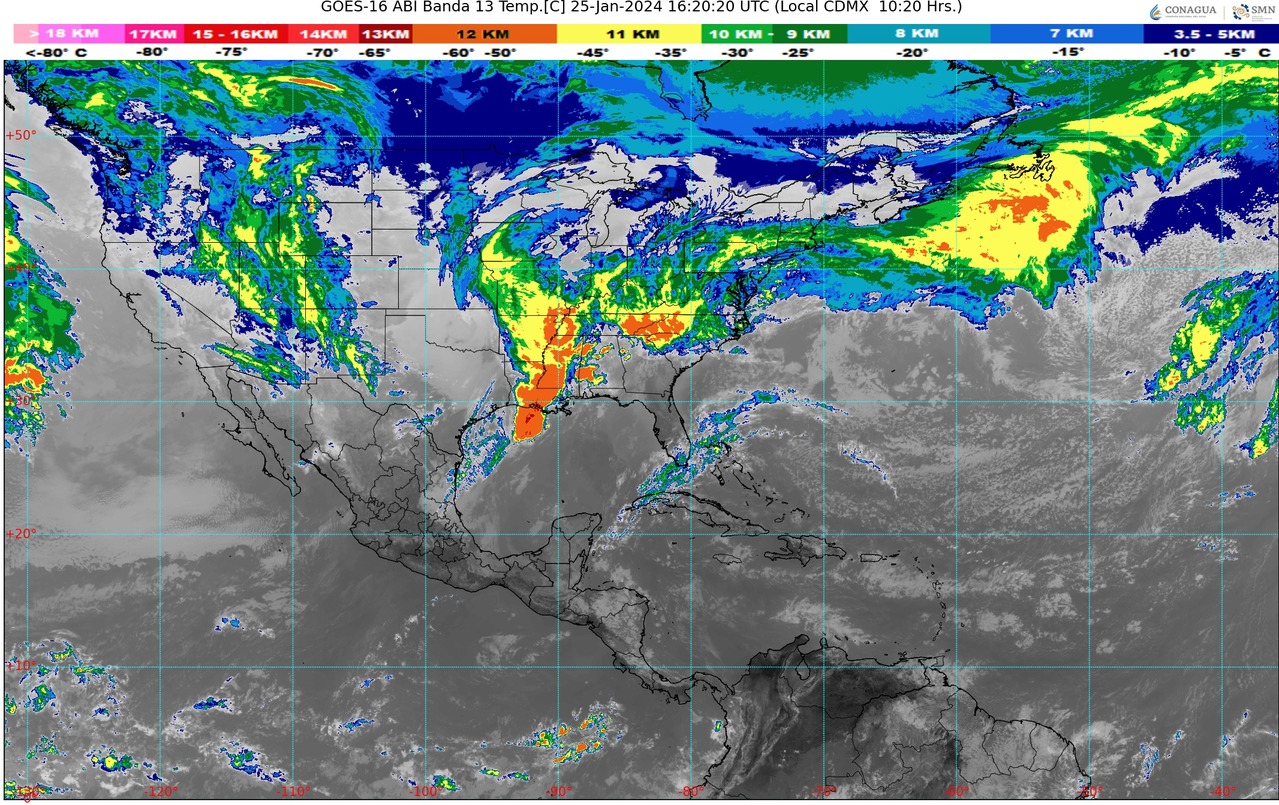 Mesa del Norte: Cielo medio nublado en el transcurso del día, con chubascos en Nuevo León y San Luis Potosí, así como lluvias aisladas en Coahuila. Sin lluvia en el resto de la región. Por la mañana, ambiente frío a muy frío en sierras de la región, siendo gélido con heladas en zonas serranas de Chihuahua y Durango. Por la tarde, ambiente fresco a templado. Viento de dirección variable de 15 a 30 km/h con rachas de 40 a 60 km/h y posibles tolvaneras en Chihuahua, Nuevo León, Durango, Zacatecas, San Luis Potosí y Aguascalientes.
