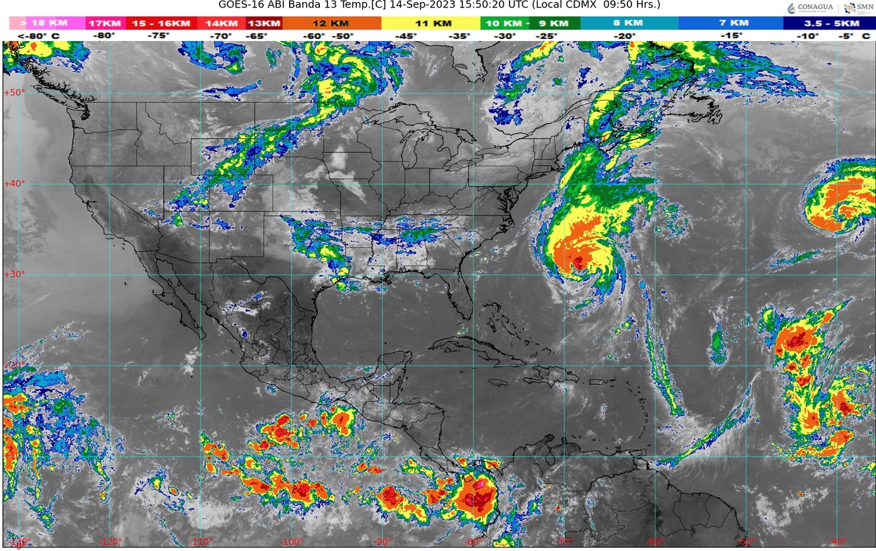 CDMX, 14 de septiembre del 2023.- Este día jueves, el frente Núm. 2 permanecerá sobre los estados fronterizos del norte del país. A su vez, el monzón mexicano se mantendrá en el noroeste del territorio nacional; ambos sistemas ocasionarán chubascos y lluvias puntuales fuertes con descargas eléctricas, fuertes rachas de viento y posible caída de granizo en las regiones mencionadas.