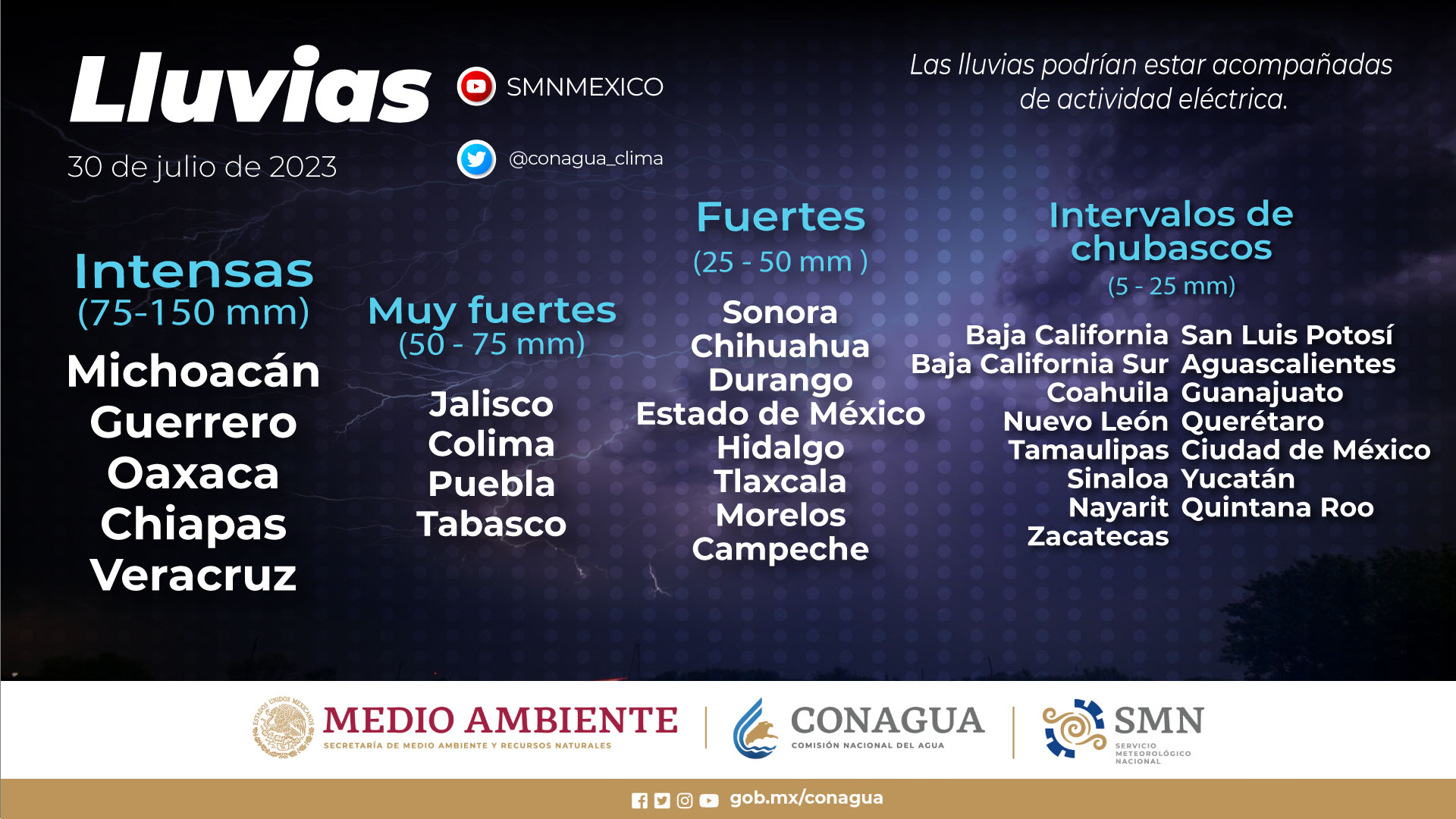 CDMX, 30 de julio del 2023.- Este día domingo, la onda tropical Núm. 17 se desplazará gradualmente sobre el oriente, centro y sur del territorio nacional, asociada con una zona de baja presión con probabilidad para desarrollo ciclónico que se ubicará al sur de las costas de Oaxaca y aunado a un canal de baja presión sobre la Península de Yucatán, producirán lluvias intensas en Michoacán, Guerrero, Veracruz, Oaxaca y Chiapas, lluvias muy fuertes en Puebla y Tabasco, además de chubascos con lluvias fuertes en el centro del país y la Península de Yucatán, incluido el Valle de México.