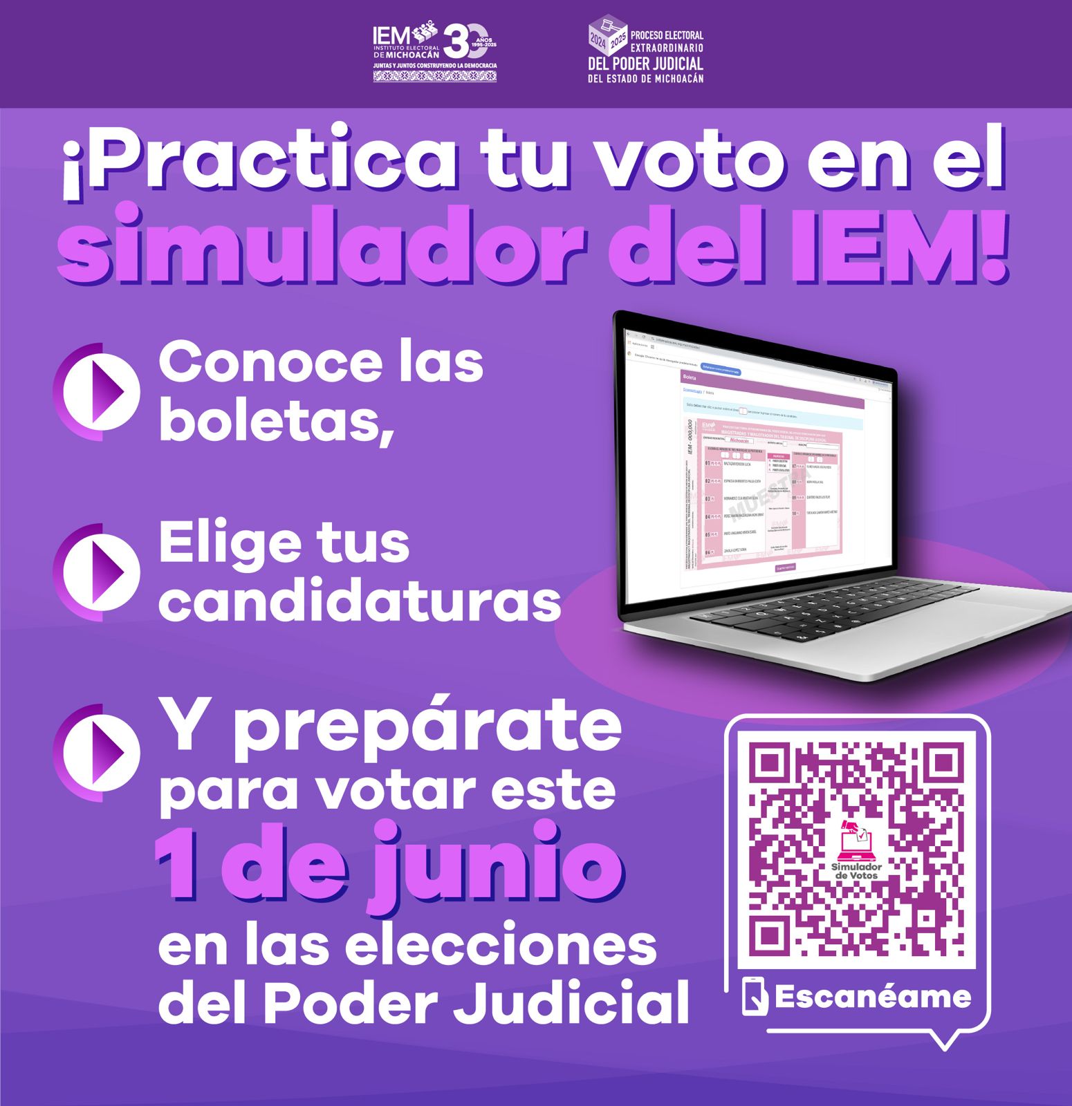 Morelia, Michoacán, 27 de mayo de 2025. Con el objetivo de que la ciudadanía llegue bien informada a las urnas el próximo 1 de junio, el Instituto Electoral de Michoacán (IEM) invita a utilizar el simulador digital “Practica tu voto”, una herramienta que te permite conocer de manera anticipada cómo serán las boletas y cómo marcar tu voto correctamente en la elección judicial extraordinaria que se llevará a cabo en Michoacán.