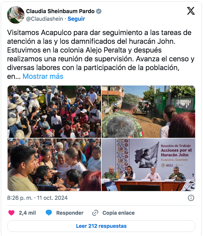 “Visitamos Acapulco para dar seguimiento a las tareas de atención a las y los damnificados del huracán John. Estuvimos en la colonia Alejo Peralta y después realizamos una reunión de supervisión. Avanza el censo y diversas labores con la participación de la población, en coordinación con el gobierno estatal y municipal. Vamos bien”, escribió la mandataria en su cuenta de X.