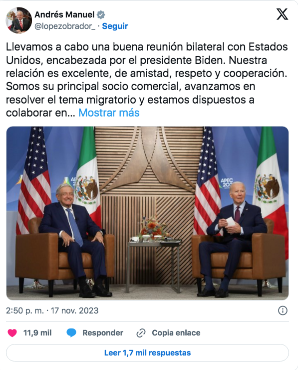 En sus redes sociales, el jefe del Ejecutivo destacó que México es el principal socio comercial de Estados Unidos y actualmente trabajan en ese país 40 millones de mexicanos.
