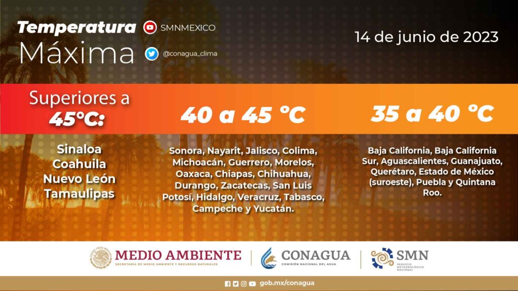 Temperaturas máximas de 40 a 45 °C: Sonora, Nayarit, Jalisco, Colima, Michoacán, Guerrero, Morelos, Oaxaca, Chiapas, Chihuahua, Durango, Zacatecas, San Luis Potosí, Hidalgo, Veracruz, Tabasco, Campeche y Yucatán.