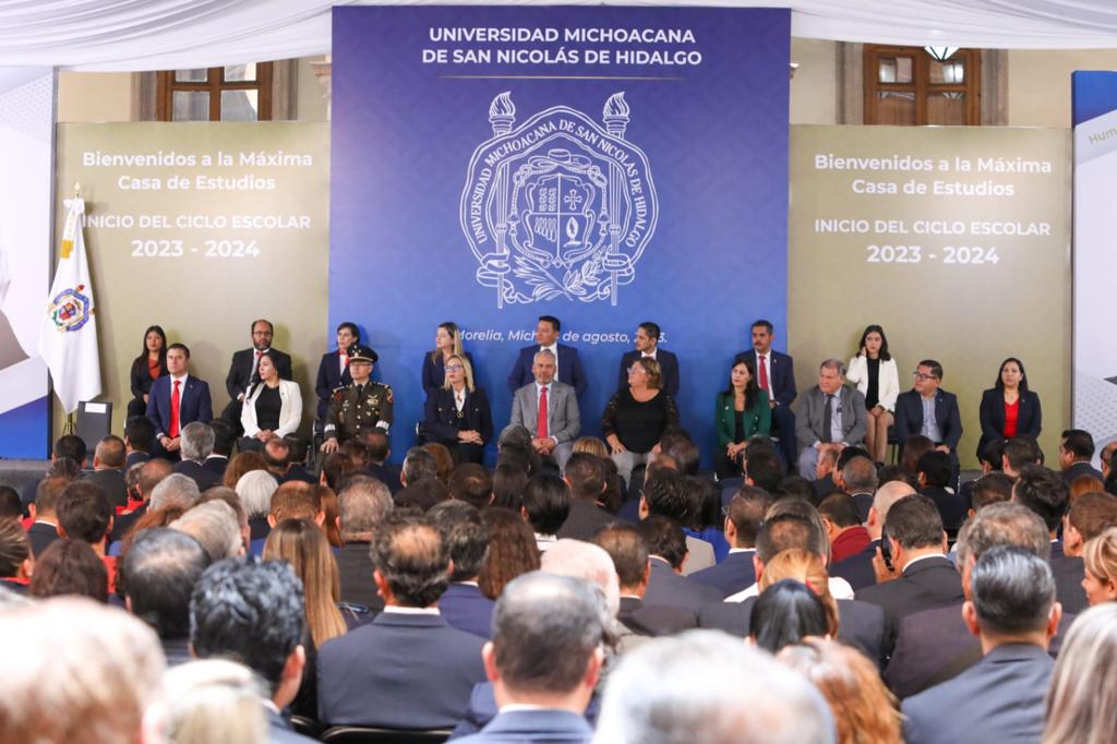 Morelia, Michoacán, a 14 de agosto de 2023.- “La Universidad requiere una sacudida, una actualización en favor de los jóvenes que tenemos aquí, no de nuestras carreras, ni de nuestras aspiraciones políticas o académicas, o de nuestros egos de academia, sino nos debemos básicamente a los jóvenes de Michoacán, por eso estamos totalmente impulsando y respaldando el cambio que está haciendo la doctora Yarabí”, afirmó el gobernador, Alfredo Ramírez Bedolla, al encabezar con la rectora Yarabí Ávila González, el arranque del ciclo escolar 2023-2024.