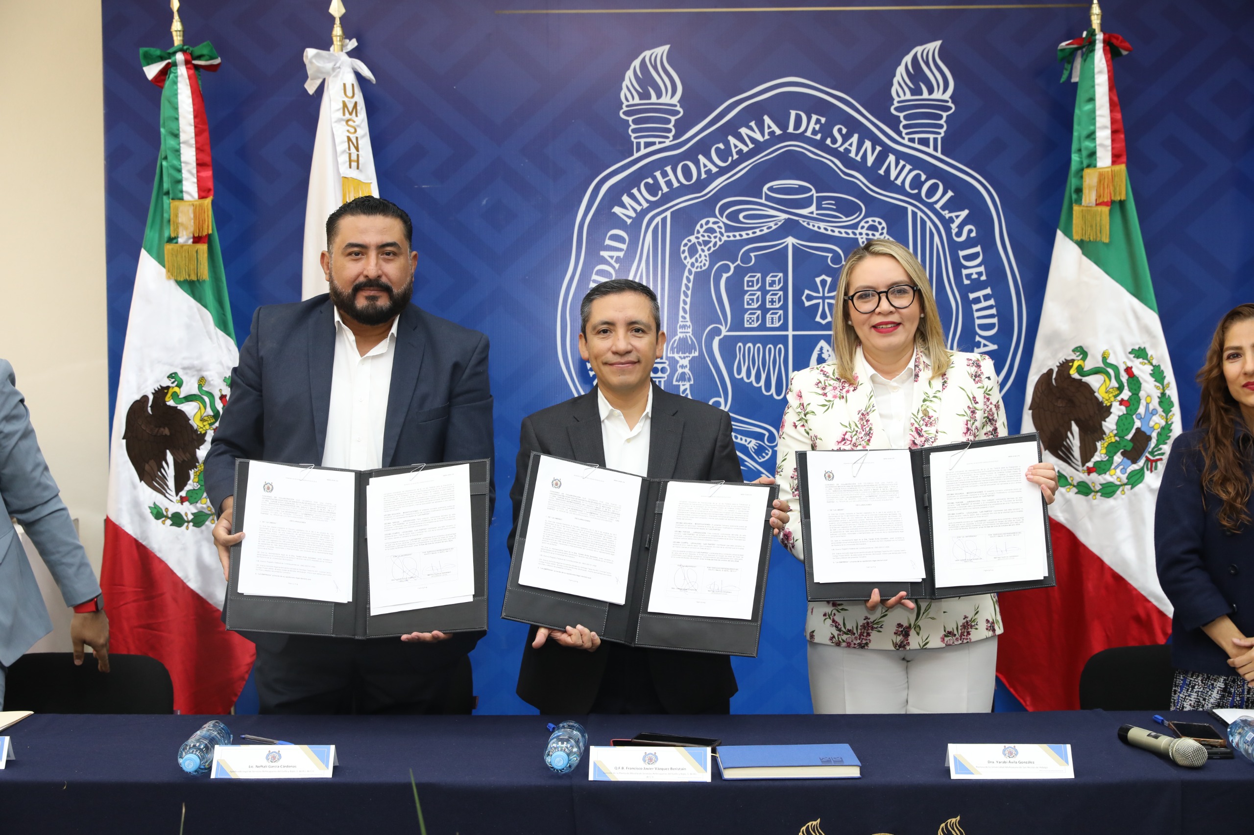 Acompañada por integrantes del gabinete Legal y directoras y directores de diversas facultades, la rectora destacó la presencia de los representantes de la empresa y celebró signar este acuerdo, tras señalar que la UMSNH siempre tendrá las puertas abiertas para sumar en acciones que construyan y que tengan un beneficio para las y los nicolaitas y para la sociedad en general.