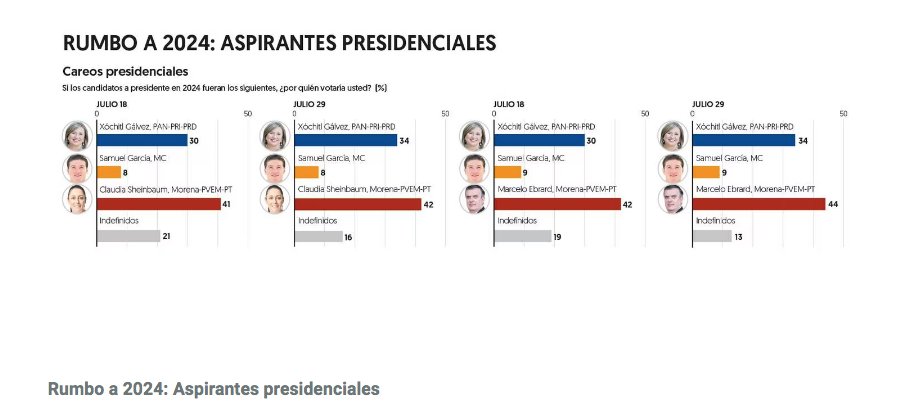 CDMX, 08 de agosto del 2023.- Si las elecciones presidenciales fueran entre Xóchitl Gálvez, del Frente opositor; Claudia Sheinbaum, de Morena-PVEM-PT, y Samuel García, de MC, la senadora de oposición obtendría 34 por ciento de las preferencias, 8 puntos por debajo de la ex jefa de Gobierno, quien captaría 42 por ciento.