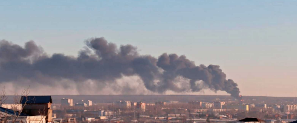 Columna de humo sobre el aeródromo de Kursk, en Rusia, atacado con un dron