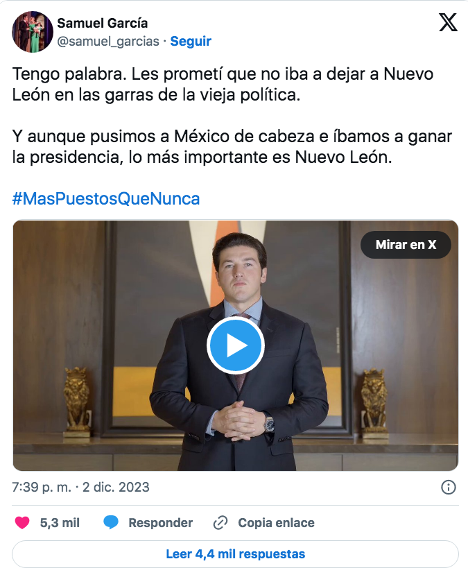 02 de diciembre del 2023.- Samuel García Sepúlveda emitió un mensaje en redes sociales tras oficializar su renuncia a la candidatura de Movimiento Ciudadano a la presidencia de México.