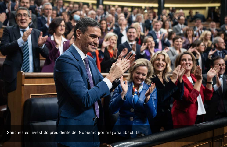 16 de noviembre del 2023.- Cuatro meses después de las elecciones generales, el líder del PSOE, Pedro Sánchez, ha sido investido presidente del Gobierno en primera votación y por mayoría absoluta gracias a los 179 votos de PSOE, Sumar, ERC, Junts, EH Bildu, PNV, BNG y CC, que configuran un nuevo bloque de investidura más que heterogéneo en un Congreso de los diputados que queda partido en dos mitades muy enfrentadas.