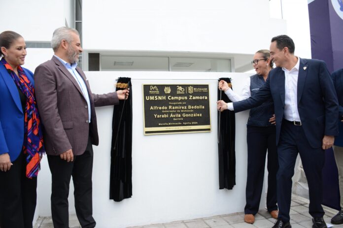 Zamora, Michoacán, a 14 de agosto de 2024.- La Universidad Michoacana de San Nicolás de Hidalgo (UMSNH) está formalmente en Zamora a través de la Unidad Profesional que puso en marcha el gobernador del estado Alfredo Ramírez Bedolla y la rectora Yarabí Ávila González.