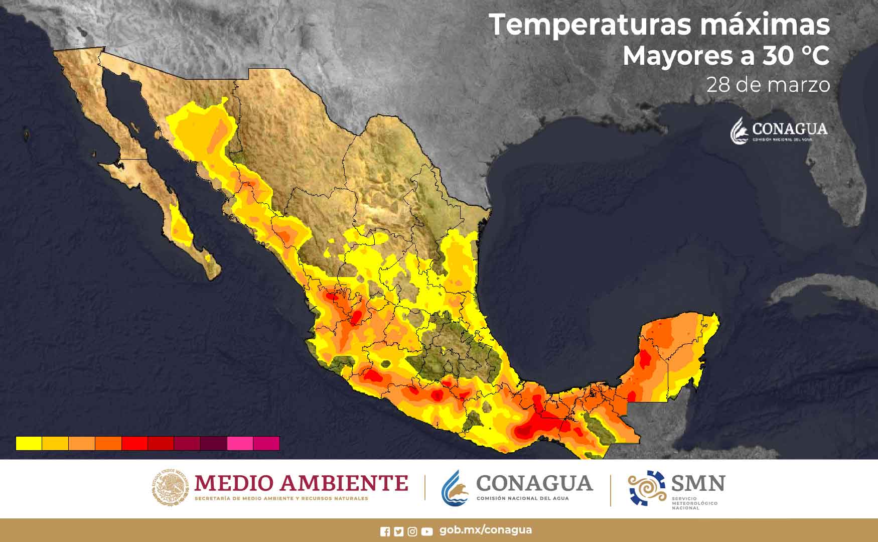 Temperaturas máximas de 30 a 35 °C: Baja California Sur, Sonora (sur), Coahuila (sur), Tamaulipas, San Luis Potosí, Zacatecas, Durango, Aguascalientes, Guanajuato, Querétaro, Hidalgo y Estado de México (suroeste).