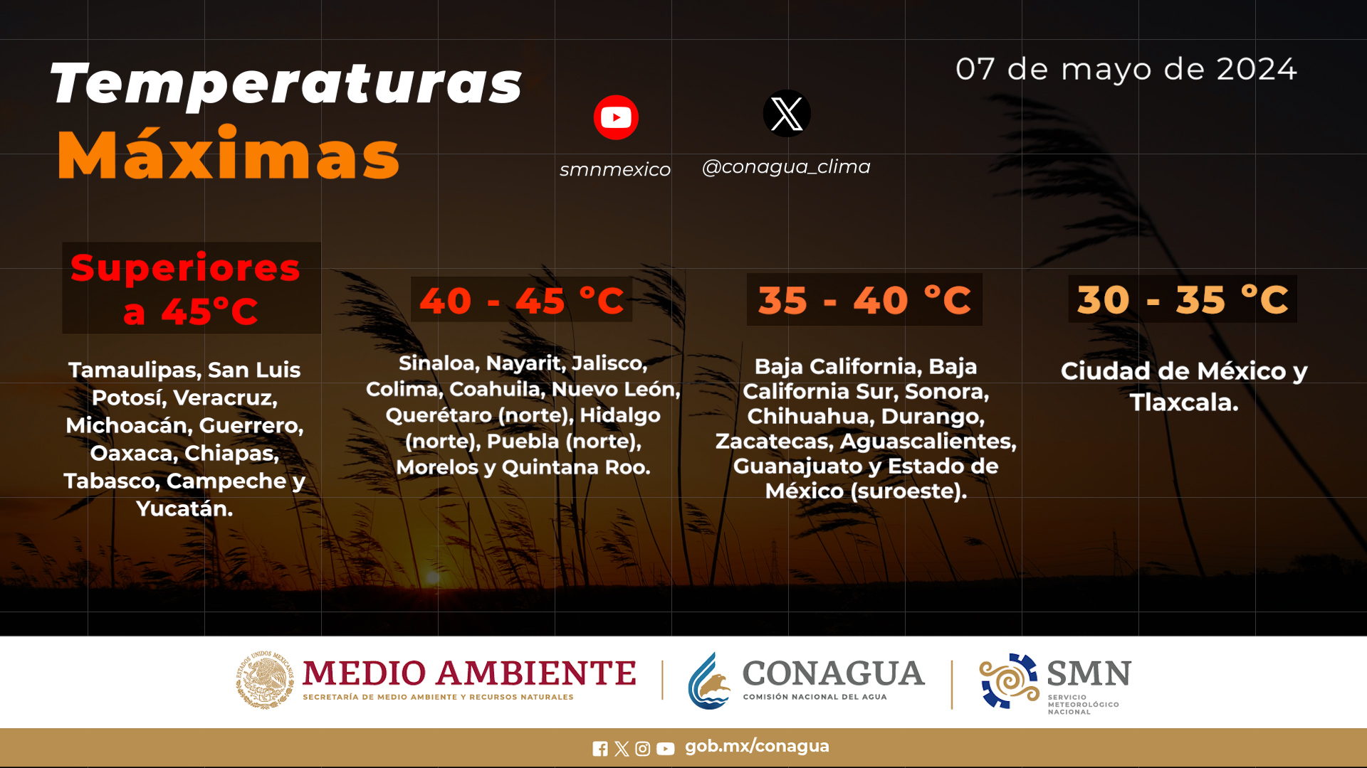 Temperaturas máximas superiores a 45 °C: Tamaulipas, San Luis Potosí, Veracruz, Michoacán, Guerrero, Oaxaca, Chiapas, Tabasco, Campeche y Yucatán.