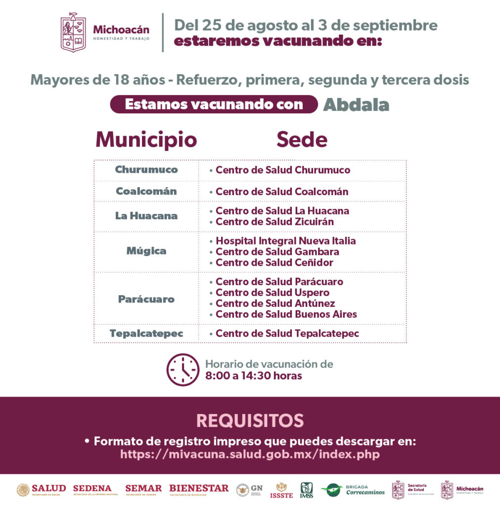 Se estará aplicando el biológico Abdala en un horario 8:30 a 15:00 horas, quienes deberán presentarse con su formato de registro impreso, el cual podrán descargar en la página https://mivacuna.salud.gob.mx/index.