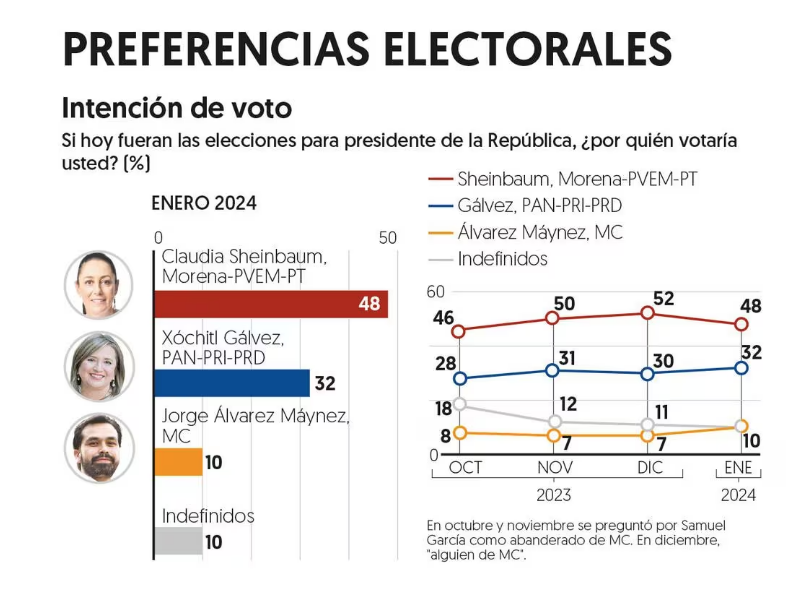 CDMX, 29 de enero del 2024.- Una encuesta nacional de El Financiero realizada en enero de 2024 revela que Claudia Sheinbaum cuenta con 48 por ciento de las preferencias en la contienda presidencial, mientras que Xóchitl Gálvez capta 32 por ciento y Jorge Álvarez Máynez recibe 10 por ciento, con otro 10 por ciento de personas que no manifestaron preferencia.