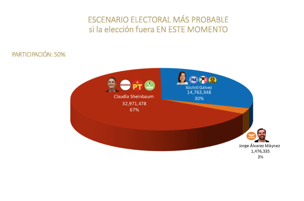 Por su parte, el escenario electoral más probable si las elecciones fueran en este momento señalan que la candidata opositora Xóchitl Gálvez —quien abandera los partidos Acción Nacional (PAN), Revolucionario Institucional (PRI) y de la Revolución Democrática (PRD)— no llegaría ni a la mitad de los votos de Sheinbaum: 14 millones 763 mil 348, equivalente al 30 por ciento.