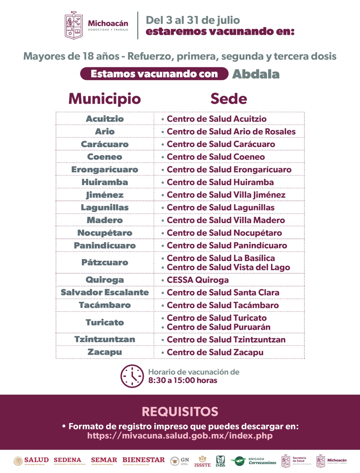 Del 3 al 31 de julio del año en curso se inmunizará con el biológico Abdala a habitantes de Acuitzio, Ario, Carácuaro, Coeneo, Erongarícuaro, Huiramba, Jiménez, Lagunillas, Madero, Nocupétaro, Panindícuaro, Pátzcuaro, Quiroga, Salvador Escalante, Tacámbaro, Turicato, Tzintzuntzan y Zacapu.
