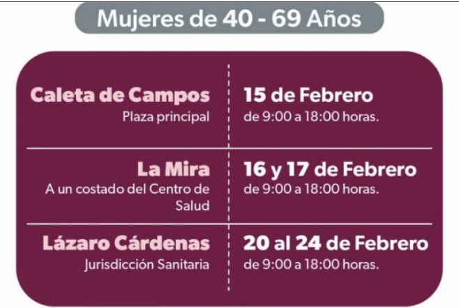 Morelia, Mich., 16 de febrero del 2023.- Del 15 al 24 de febrero, la Secretaría de Salud de Michoacán (SSM) llevará mastografías gratuitas a mujeres de entre 40 a 69 años del municipio de Lázaro Cárdenas.
