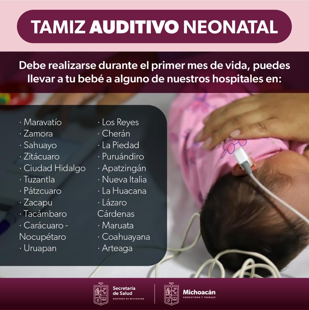 Para que los padres de familia no tengan que desplazarse hasta Morelia a solicitar este estudio, la SSM también aplica el tamiz auditivo neonatal en 22 hospitales del interior del estado, con solo presentarse de lunes a viernes en el área de Medicina Preventiva, con copia de identificación oficial y Clave Única de Registro de Población (CURP) de la madre o padre y el certificado de nacimiento del bebé.