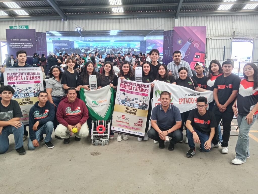 Pachuca, Hidalgo, 2 de marzo de 2025.- Estudiantes del Colegio de Estudios Científicos y Tecnológicos del Estado de Michoacán (Cecytem) ganaron cuatro títulos en las categorías: Programación, Robot Skill, Diseño y Excelencia, dentro del XVI Campeonato Nacional de Robótica y Habilidades STEM, que tuvo lugar en Pachuca Hidalgo.