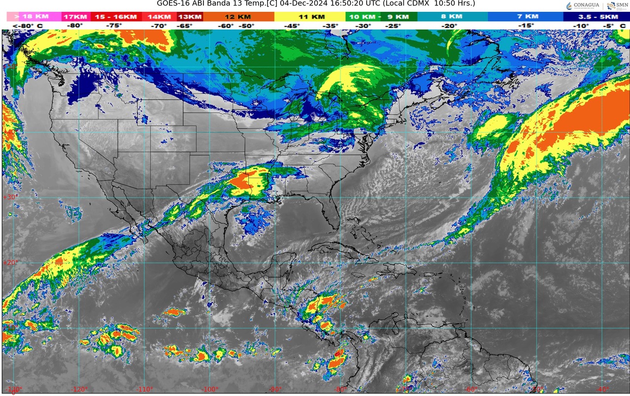 CDMX, 04 de diciembre del 2024.- Durante este miércoles, el frente No. 12 se extenderá con características de estacionario sobre el noreste del territorio nacional, interaccionará con un canal de baja presión, localizado sobre el occidente del golfo de México, generando lluvias y chubascos sobre el noreste y oriente del país, además de viento con rachas de hasta 60 km/h en Tamaulipas y Veracruz.