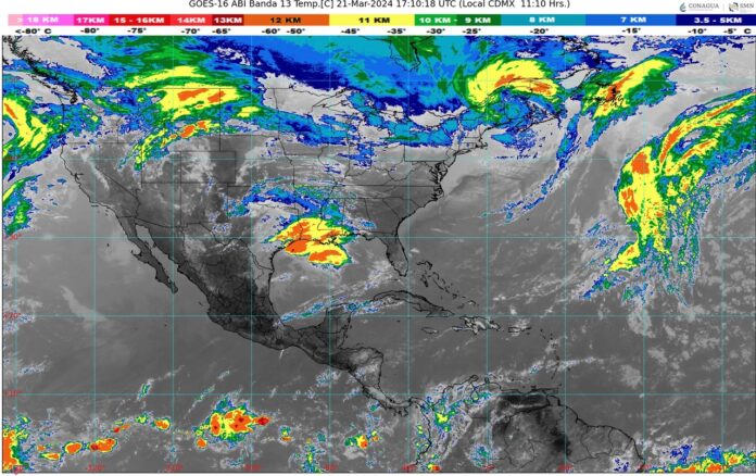 CDMX, 21 de marzo del 2024.- Para hoy jueves, un frente frío se aproximará al noreste del territorio nacional e interaccionará con el aporte de humedad generado por la corriente en chorro subtropical, lo que ocasionará lluvias e intervalos de chubascos con descargas eléctricas, además de rachas de viento fuertes a muy fuertes en el norte y noreste del país, con probable formación de torbellinos en Coahuila, Nuevo León y Tamaulipas.