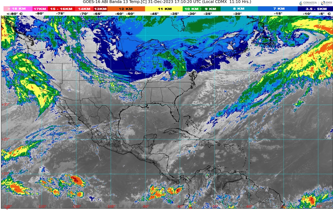Pacífico Centro: Ambiente frío a muy frío al amanecer, con posibles heladas y bancos de niebla en zonas serranas de Jalisco y Michoacán. Por la tarde, ambiente templado a cálido, siendo caluroso en zonas costeras de la región. Cielo parcialmente nublado y sin lluvia en la región. Viento de dirección variable de 10 a 20 km/h con rachas de hasta 40 km/h. Oleaje de 1 a 3 metros de altura, corrientes de arrastre y marejadas en costas de Jalisco, Colima y Michoacán.