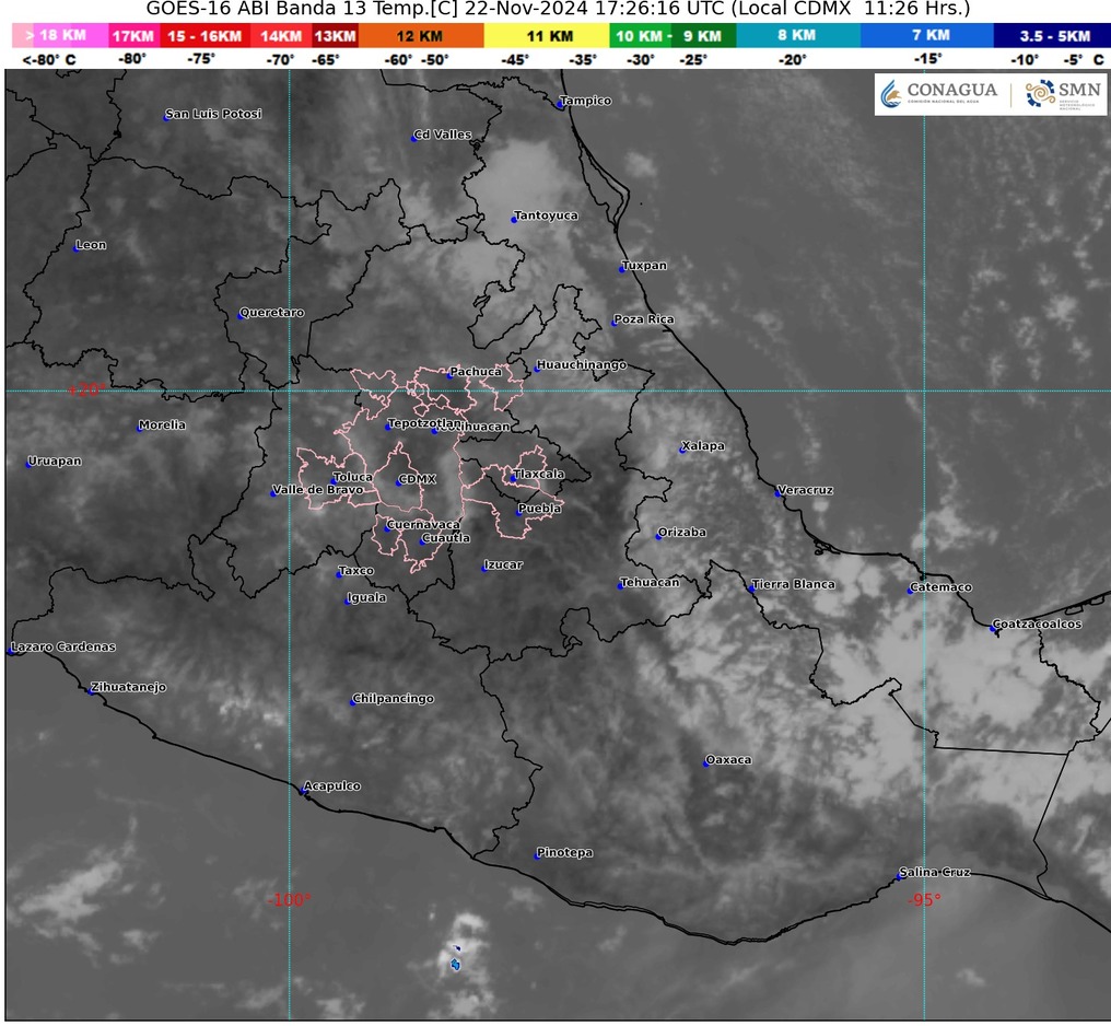 CDMX, 22 de noviembre del 2024.- Para hoy viernes, la masa de aire frío asociada al frente No. 10 modificará sus características térmicas, por lo que se prevé un gradual ascenso de las temperaturas diurnas sobre gran parte de México, sin embargo, durante la mañana y noche prevalecerá el ambiente frío con bancos de niebla en estados de la Mesa del Norte, Mesa Central y valle de México, así como ambiente muy frío a gélido con heladas en zonas altas de dichas regiones.