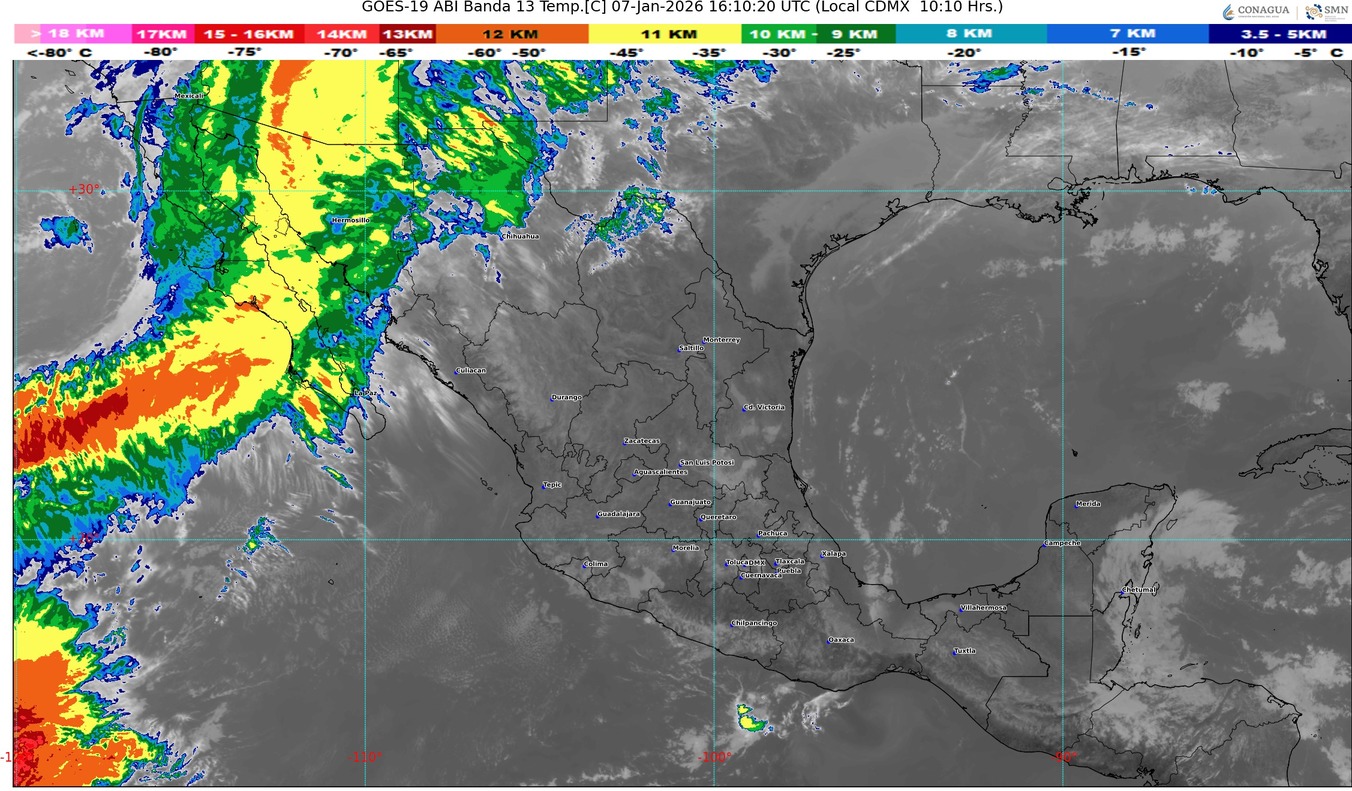 CDMX, 07 de enero del 2026.- En el transcurso de este día miércoles, el frente frío núm. 27 se desplazará sobre el noroeste y norte del país, en combinación con una circulación ciclónica en niveles medios y altos de la atmosfera,además de las corrientes en chorro polar y subtropical, propiciarán intervalos de chubascos y vientos fuertes a muy fuertes en dichas regiones; con lluvias puntuales fuertes en Baja California, Sonora y Chihuahua, así como la caída de nieve o aguanieve en las sierras de los estados mencionados.