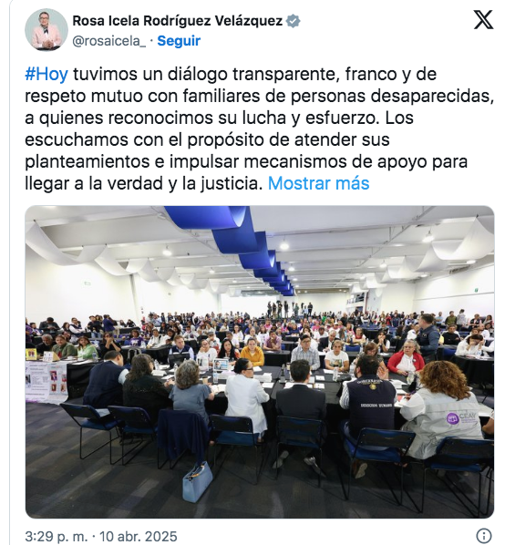 “Sabemos de su trabajo diario, de su lucha por encontrarse con sus seres queridos y eso nos obliga a actuar, a trabajar y a llegar a la verdad. Y sí, ustedes quieren saber qué pasó dónde están sus seres queridos, y es obligación de las autoridades buscarlos y es obligación de las Fiscalías hacer investigación, y es obligación de las comisiones trabajar y atender a las víctimas”, comentó Rodríguez.