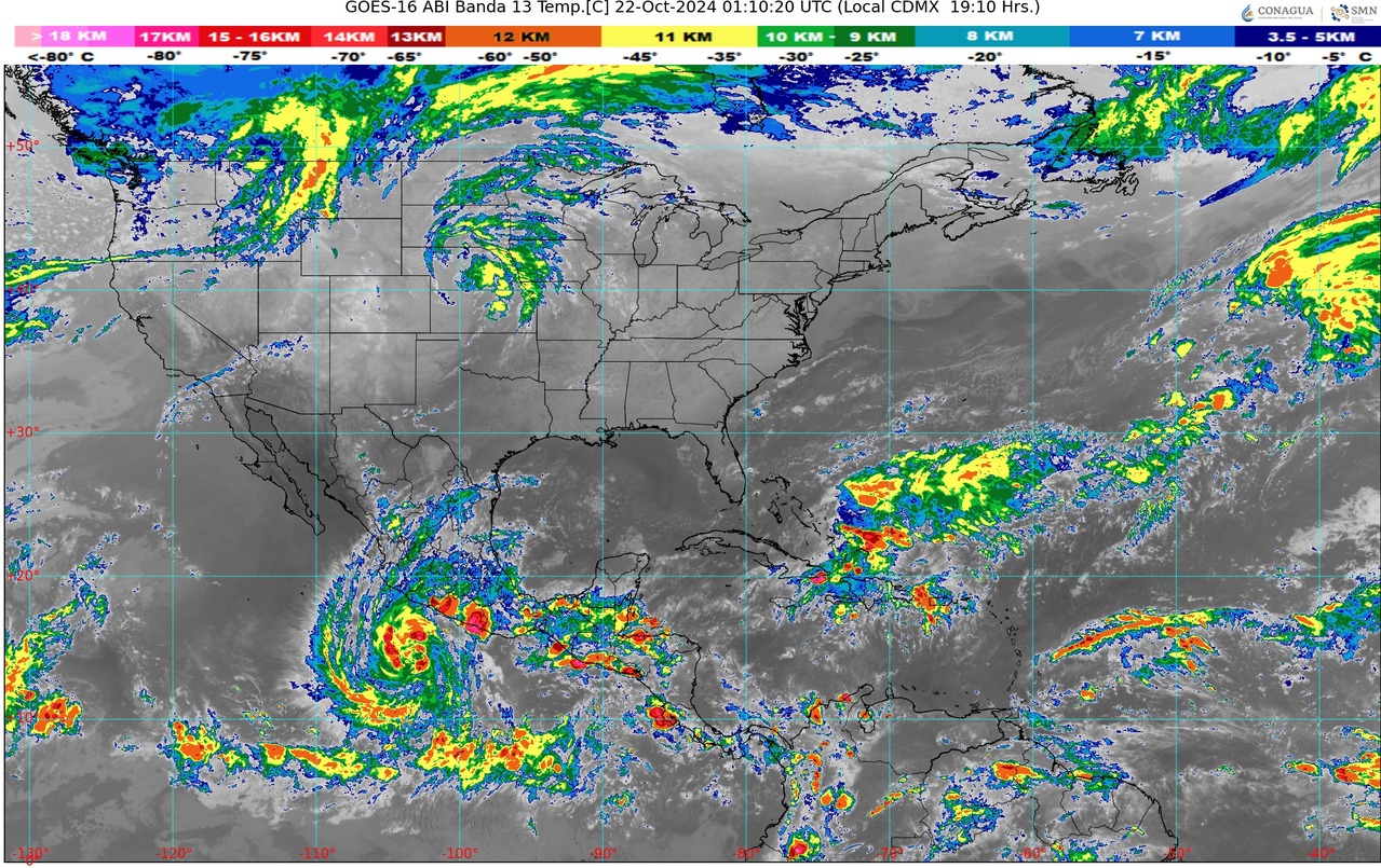 Por otra parte, un canal de baja presión extendido sobre el noreste, oriente y sureste del país mantendrá el temporal de lluvias en el oriente y sureste de México, previéndose lluvias puntuales extraordinarias en Veracruz, lluvias puntuales intensas en Puebla, Tabasco, Oaxaca y Chiapas, lluvias puntuales muy fuertes en Tamaulipas y San Luis Potosí, así como intervalos de chubascos en Nuevo León.