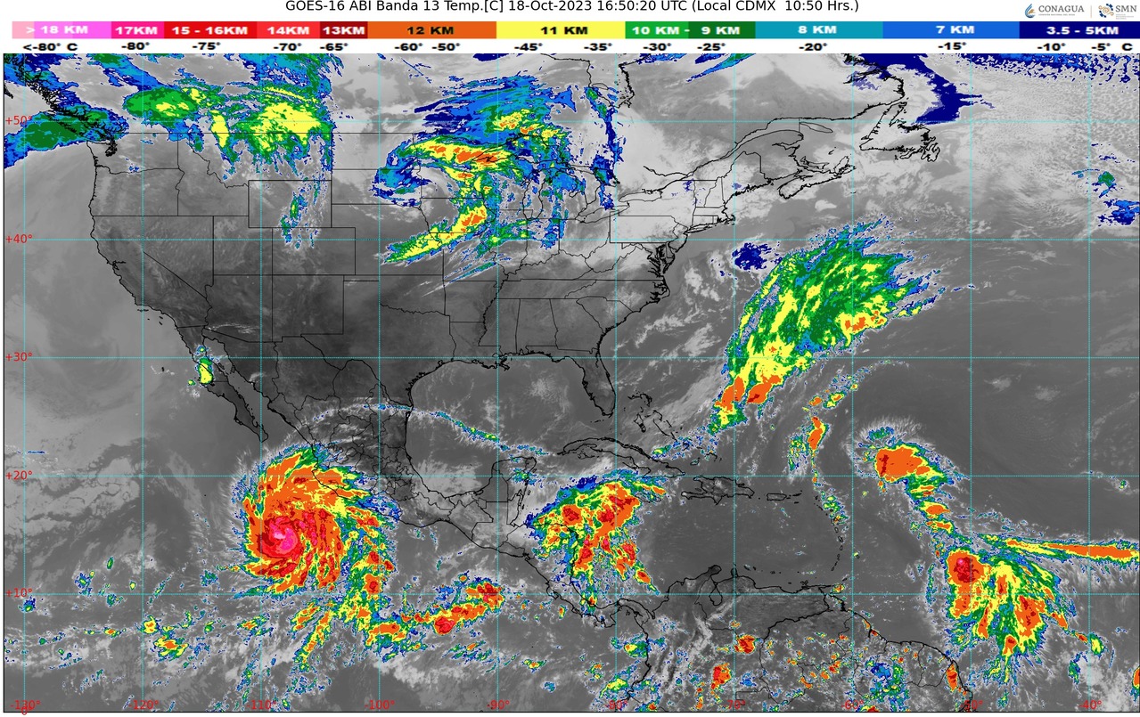 CDMX, 18 de octubre del 2023.- Este día miércoles, la tormenta tropical”Norma” podría intensificarse a huracán de categoría 1 en la escala Saffir-Simpson; asimismo, se desplazaráhacia el noroeste, frente a las costas de Jalisco y Colima; sus bandas nubosas producirán lluvias puntuales intensas en Jalisco, Colima, Michoacán y Guerrero, además de rachas de viento de 50 a 70 km/h y oleaje de 2 a 4 metros de altura en las costas de dichos estados.