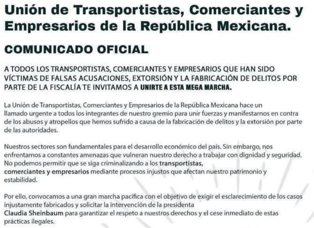 En su convocatoria compartida a través de redes sociales, los transportistas explican que han sido víctimas de falsas acusaciones, extorsión y fabricación de delitos por parte de la Fiscalía de Edomex.