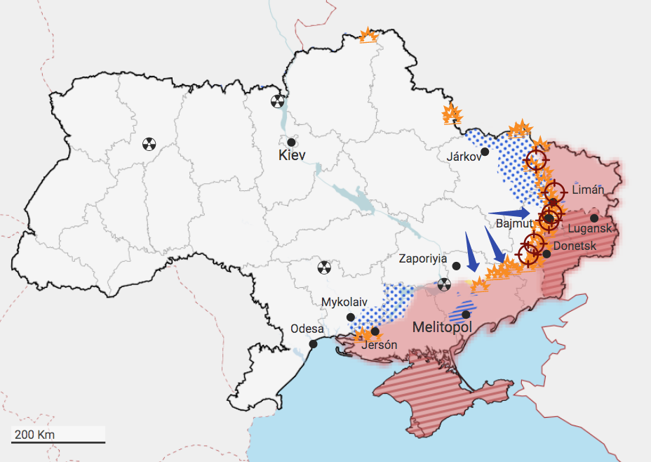 Los combates en Bajmut se siguen intensificando y milbloggers rusos mencionados por el Instituto para el Estudio de la Guerra (ISW) informan de ataques ucranianos fallidos en la carretera entre Klishchiivka y Andriivka, mientras que otras fuentes rusas aseguran haber establecido el control total sobre el asentamiento. También en la región de Donetsk, ambas tropas continúan enfrentándose en la línea entre Avdiivka y la ciudad de Donetsk, pero no se han afirmado ni confirmado avances, adelanta el think tank americano.