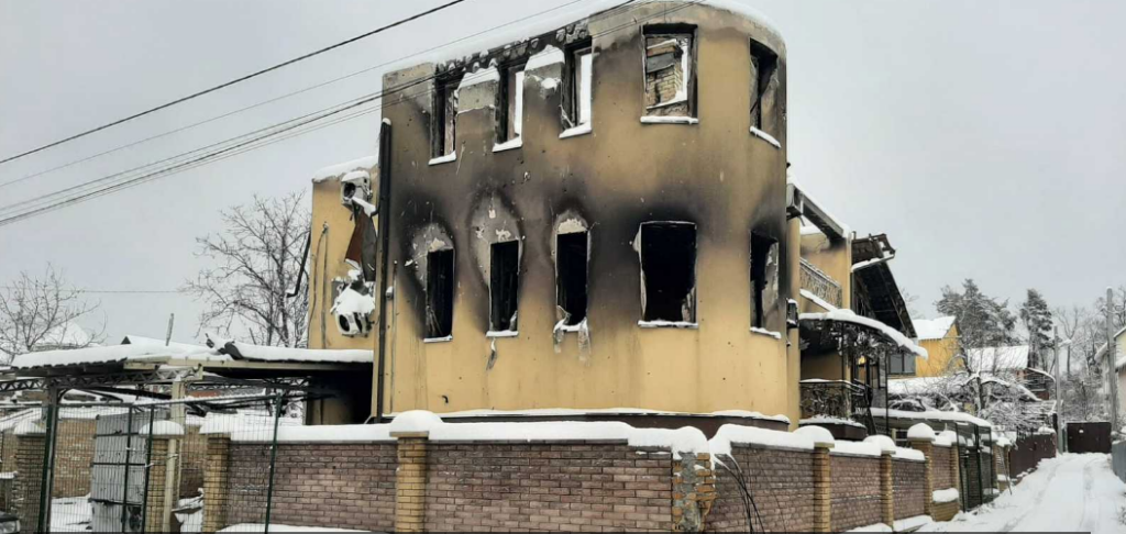 Por la mañana, bajo un manto blanco, Maidán –símbolo y emblema de tantos acontecimientos históricos de la Ucrania moderna- resplandece, aunque parece muy triste. Encauzamos la carretera de salida hacia una de las ciudades dormitorio que la guerra ha puesto en el mapa: Irpín. Por su situación geográfica, sobre todo a principios de marzo, fue escenario de cruentos combates de los que sigue habiendo un rastro muy claro, aunque los trabajos de reconstrucción se han acelerado y la nieve parece querer ocultarlo.