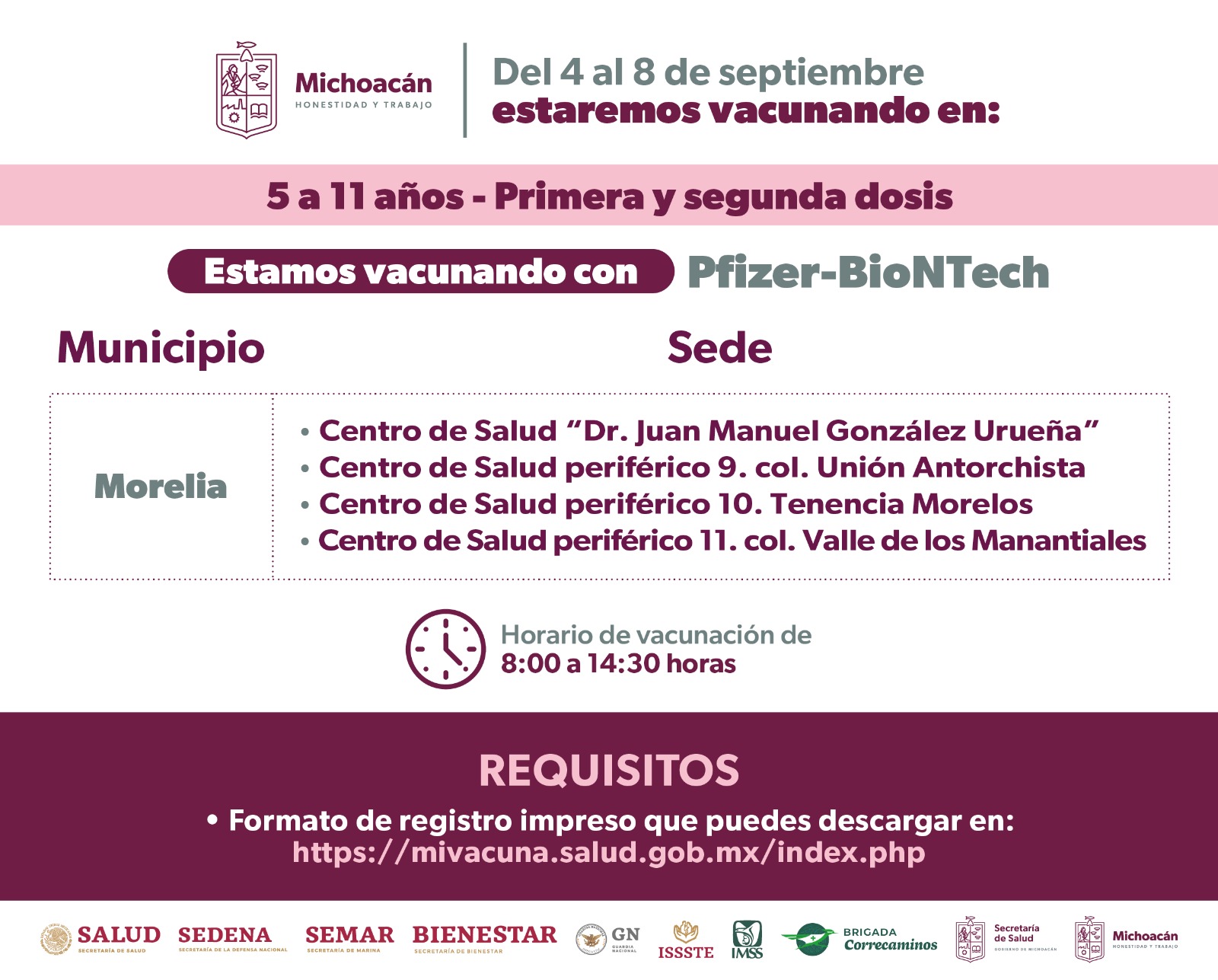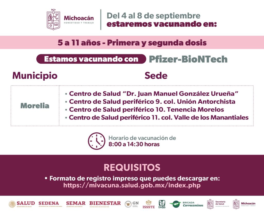 Morelia, Michoacán, 5 de septiembre de 2023.- Del 5 al 8 de septiembre, la Secretaría de Salud de Michoacán (SSM) aplicará primeras y segundas dosis de la vacuna Pfizer contra el COVID-19 a niñas y niños de cinco a 11 años cumplidos, en la plaza del Carmen del Centro Histórico de Morelia.