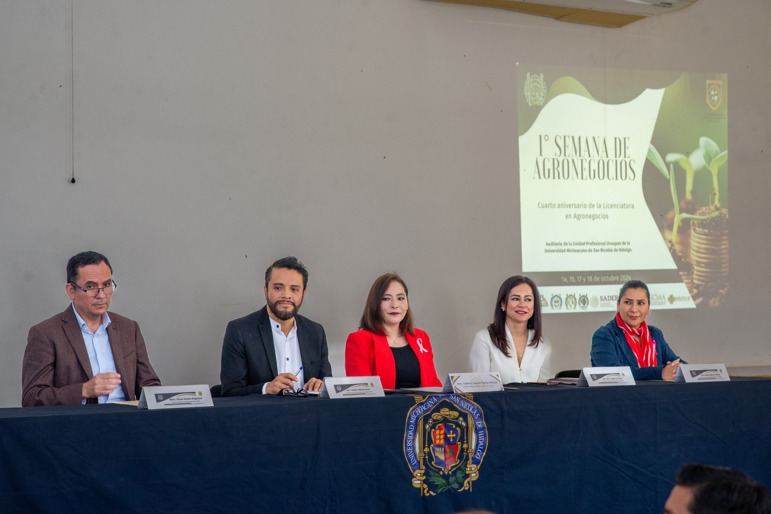 Uruapan, Michoacán, a 14 de octubre de 2024.- Al declarar inaugurada la Primer Semana de Agronegocios que se lleva a cabo del 14 al 18 de octubre en la Unidad Profesional de Uruapan, la coordinadora general de los Programas Institucionales de Licenciatura Multi-DES de la Universidad Michoacana de San Nicolás de Hidalgo (UMSNH), Andrea Araceli Farías Olvera consideró que la sostenibilidad, la innovación y el espíritu emprendedor son áreas esenciales para el futuro del sector.