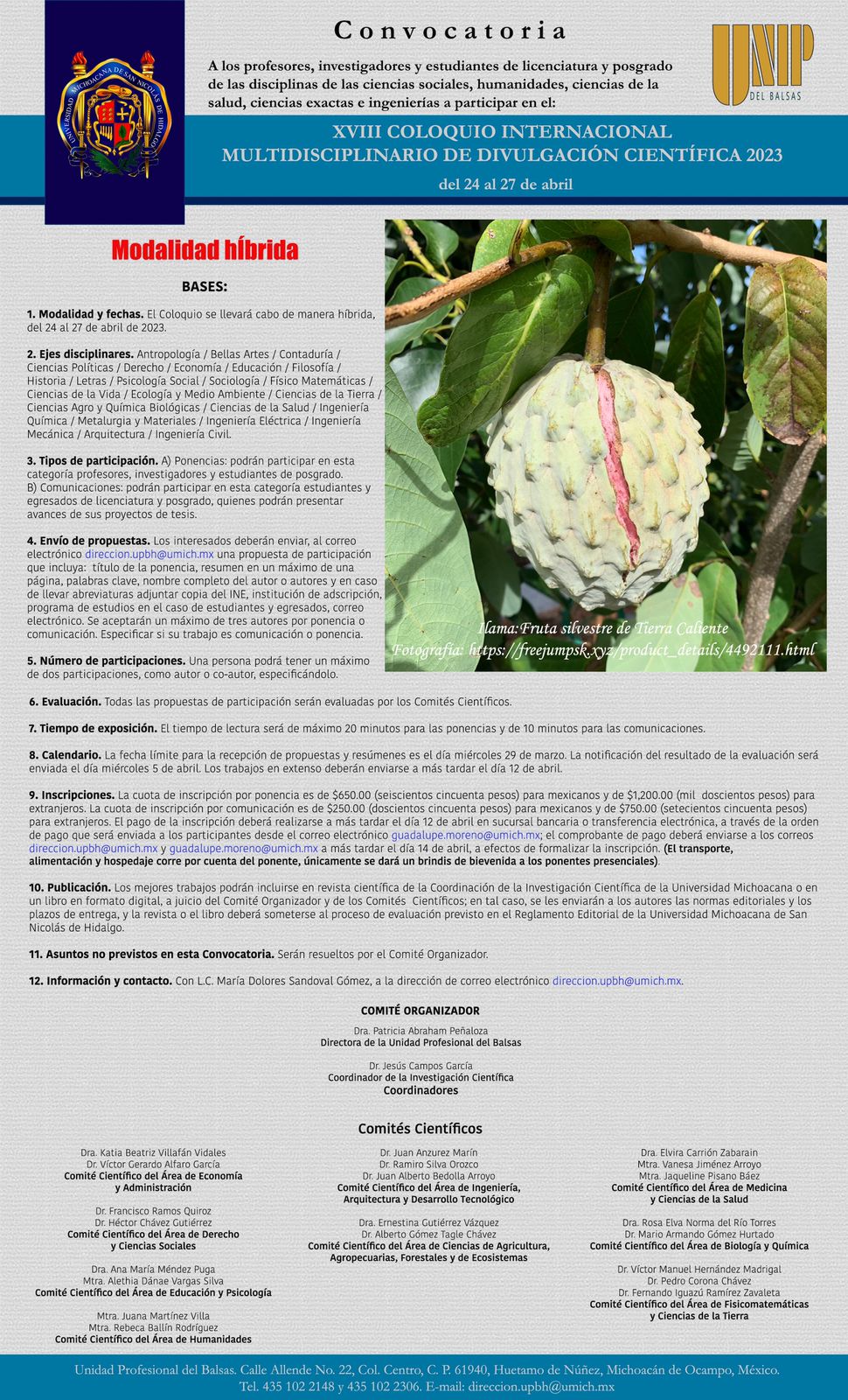 Morelia, Michoacán a 06 de abril de 2023.- Como un espacio para la divulgación del conocimiento científico y de la investigación, la Universidad Michoacana de San Nicolás de Hidalgo (UMSNH), a través de la Unidad Profesional del Balsas, se prepara para la realización del XVIII Coloquio Internacional Multidisciplinario de Divulgación Científica 2023.