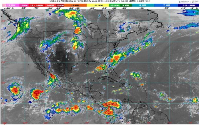 CDMX, 22 de agosto del 2024.- Para hoy jueves, el monzón mexicano en combinación con inestabilidad en niveles altos de la atmósfera, originará lluvias puntuales fuertes en Durango y Sinaloa; intervalos de chubascos en Baja California Sur, Chihuahua y Sonora; y lluvias aisladas en zonas de Baja California.