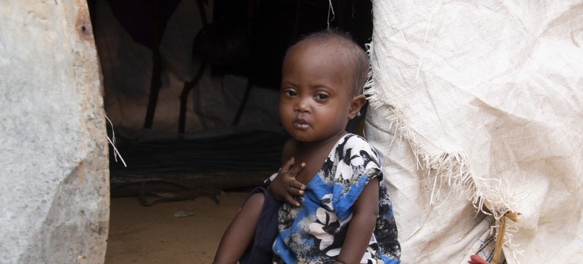 UNICEF/UN0742088/Condren Una niña sentada frente a la tienda de campaña en la que vive su familia en un campo de desplazados internos en Mogadiscio, Somalia, en octubre de 2022.