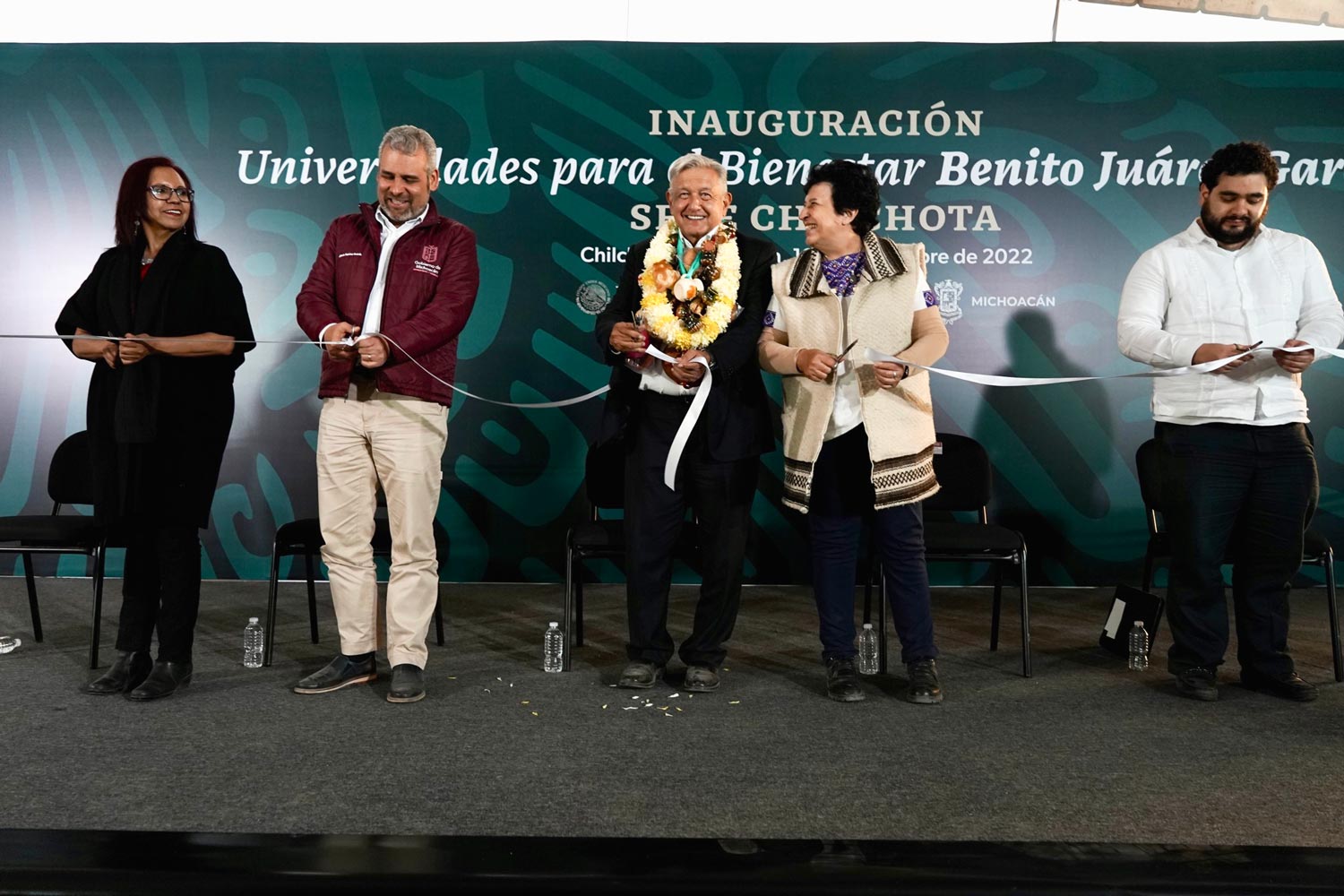 Acompañaron al presidente, el gobernador de Michoacán, Alfredo Ramírez Bedolla; la secretaria de Educación Pública, Leticia Ramírez Amaya; la directora general del Organismo Coordinador de las Universidades para el Bienestar Benito Juárez García, Raquel Sosa Elízaga; el subsecretario Egresos de la Secretaria de Egresos y Crédito Público, Juan Pablo de Botton Falcón y el coordinador académico de Universidad para el Bienestar Benito Juárez García, sede educativa, Mario García Ávalos.