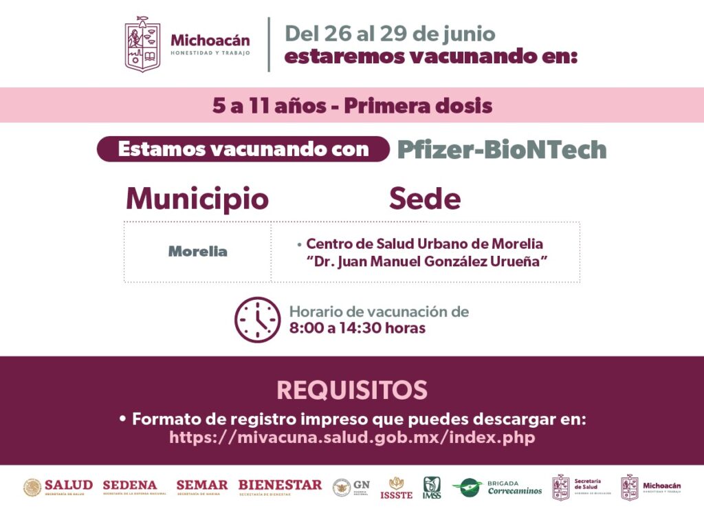 Morelia, Michoacán, 26 de junio de 2023.- La Secretaría de Salud de Michoacán (SSM) amplió la campaña de vacunación contra el COVID-19 en los municipios de Morelia y Uruapan para que todas las niñas y niños de cinco a 11 años cumplidos puedan vacunarse.