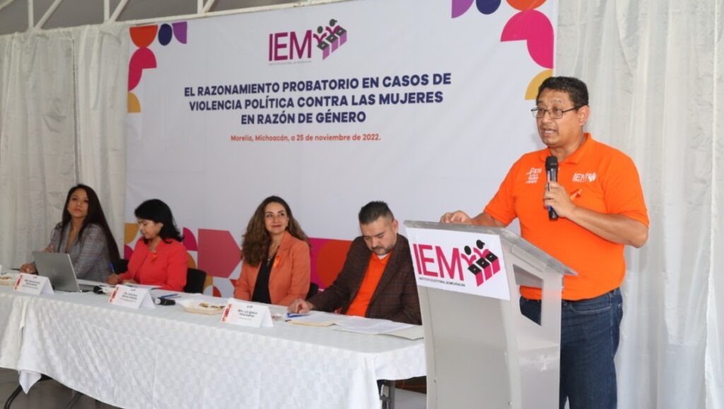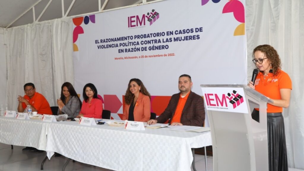 Morelia, Michoacán, 28 de noviembre de 2022. En el marco de la conmemoración del día internacional de la eliminación de la violencia contra la mujer se realizó el panel “El razonamiento probatorio en casos de violencia política contra las mujeres en razón de género”, organizado por el IEMich e integrado por Alma Bahena Villalobos, Magistrada Presidenta del Tribunal Electoral del Estado de Michoacán (TEEM); Irma Rosa Lara Hernández, secretaria de estudio y cuenta de la Sala Regional Guadalajara del Tribunal Electoral del Poder Judicial de la Federación; María de Jesús García Ramírez, Maestra en razonamiento jurídico y ex Presidenta del TEEM; así como el Mtro. Luis Ignacio Peña Godínez, consejero del IEMich